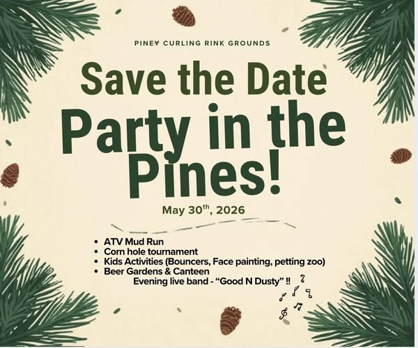 Visit iCal Export Google Calendar Outlook 365 Outlook Live May 30, 2026 All Day Party in the Pines Piney Curling Rink 46 Blueberry Street, Piney, Manitoba Details Other Events Piney Curling Rink Save the date for Party in the Pines, including Piney’s annual ATV Mud Run, cornhole tournament, kids activities, beer gardens and canteen, with live band Good N Dusty in the evening.