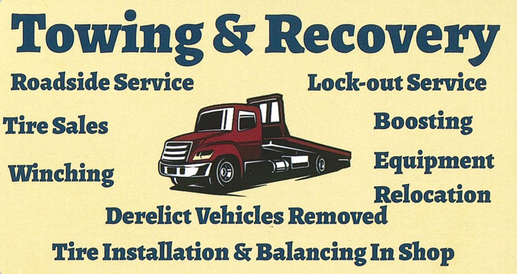 Roadside Service, Tire Sales, Winching, Lock-out Service, Boosting, Equipment Relocation, Derelict Vehicles Removed, Tire Installation & Balancing Shop