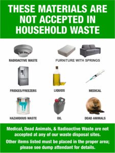 The household dumping pit at the Sprague Waste Disposal Site is closed. All household materials must be disposed of using the green transfer bins and recycling in the blue transfer bins.