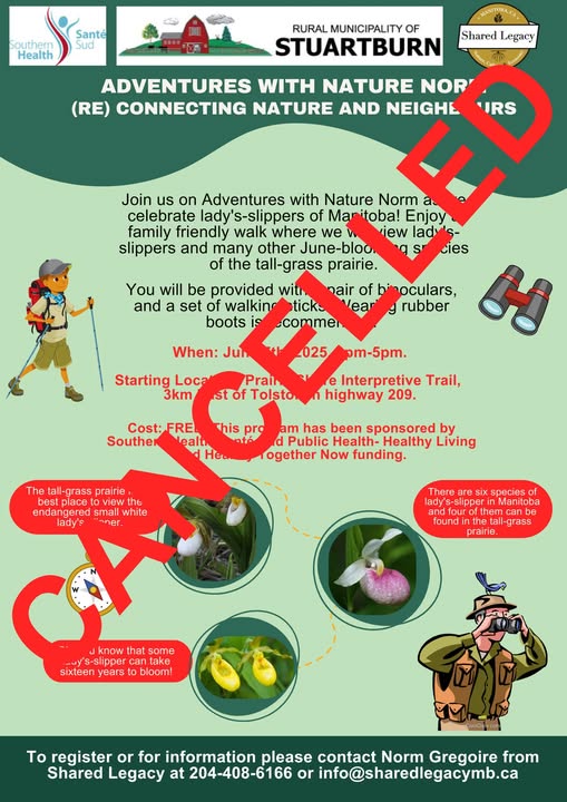 EVENT CANCELLED. Due to the wildfire risk across Manitoba, all trails on the Manitoba Tall-Grass Prairie Preserve have been closed until further notice. As a result, the Nature Norm tour has been cancelled. The situation is being closely monitored to reopen the trails as soon as it is safe to do so.