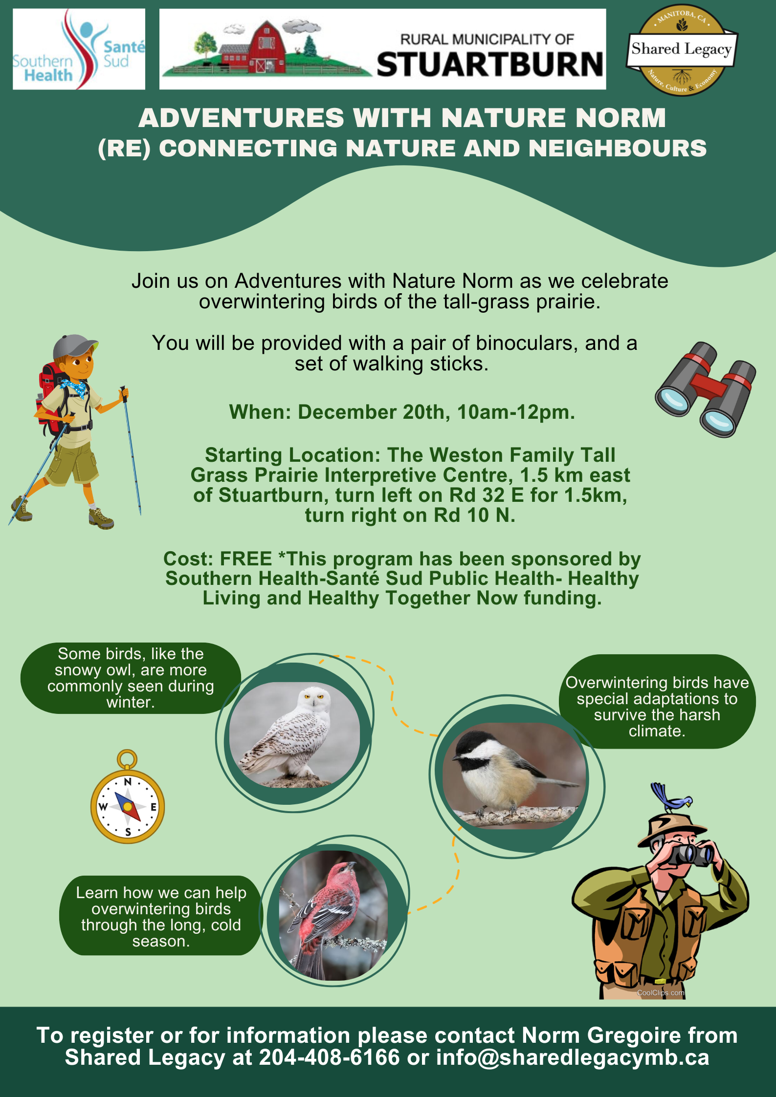 Join us on Adventures with Nature Norm for a morning of connecting nature and neighbours as we celebrate overwintering birds of the tall grass prairie, while enjoying the great outdoors!