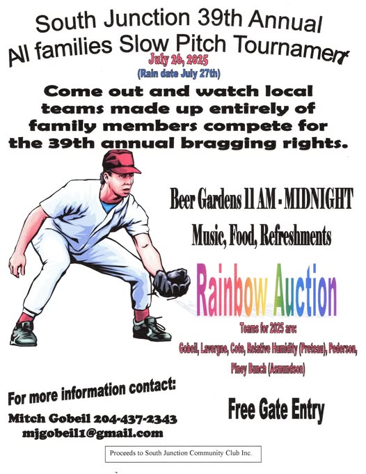 This event has passed. 39th Annual Family Slow Pitch Tournament July 26 « Middlebro Grit & Glory Games Pancake Breakfast » Join us for South Junction’s 39th Annual All Families Slow Pitch Tournament on Saturday July 26! Enjoy music, food, refreshments and rainbow auction. Beer gardens 11am – midnight. For more information: Mitch Gobeil 204-437-2343 mjgobeil1@gmail.com Proceeds to South Junction Community Club Inc. Organizer: South Junction Community ClubVenue: South Junction ParkAddress: Fraser Ave.
