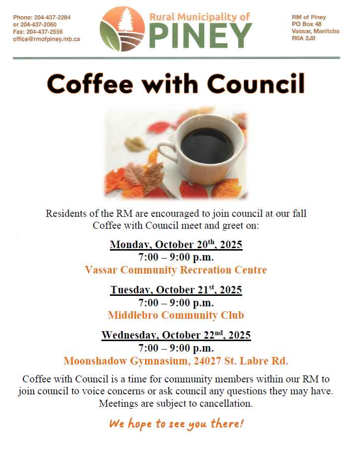 This event has passed. Fall Coffee With Council – St. Labre October 22 @ 7:00 pm - 9:00 pm « Fall Coffee With Council – Middlebro Southeast Farmer’s Market » Coffee with Council is a time for community members within our RM to join council to voice concerns or ask council any questions they may have. Meetings are subject to cancellation. Wednesday, October 22nd, 2025 7:00 – 9:00 p.m. Moonshadow Gymnasium Organizer: Rural Municipality of PineyVenue: Moonshadow GymnasiumAddress: 24027 St. Labre Rd.