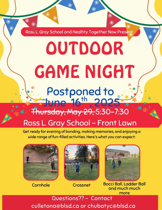 This event has passed. Outdoor Game Night June 16 @ 5:30 pm - 7:30 pm « Piney Regional Chamber of Commerce EBCH Book Sale » Ross L Gray School and Healthy Together Now Present Outdoor Game Night POSTPONED: Monday, June 16, 2025 from 5:30 – 7:30pm Maximum 25 participants Please register by emailing: chubatyc@blsd.ca or culletona@blsd.ca Organizer: Ross L Gray SchoolVenue: Vassar ParkAddress: