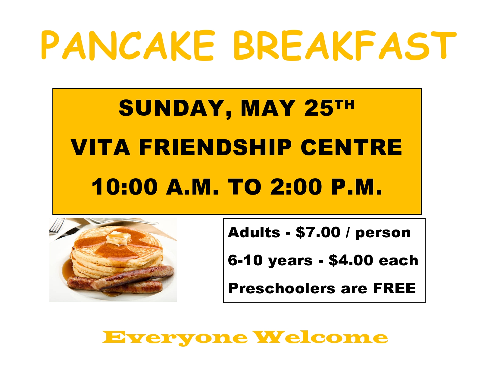 This event has passed. Pancake Breakfast May 25 @ 10:00 am - 2:00 pm « Car Show on the Ridge Fishing Derby » Gather your family and friends for a morning out – everyone is welcome! Vita Friendship Centre, Sunday, May 25, 2025 Adults $7 Children 6-10 years $4 Preschoolers FREE Organizer: Vita Friendship CentreVenue: Vita Friendship CentreAddress: 226 Home St