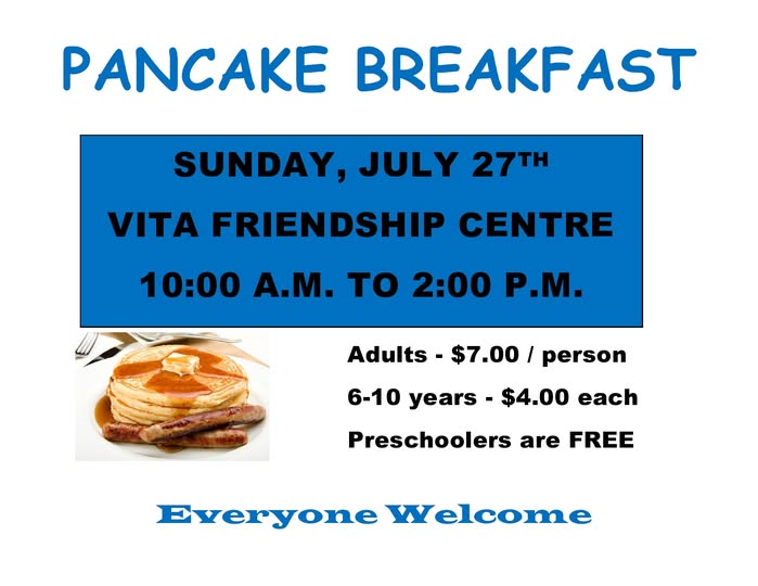 This event has passed. Pancake Breakfast July 27 @ 10:00 am - 2:00 pm « Woodridge 125th Anniversary! BBQ Lunch Fundraiser » Gather your family and friends for a morning out – everyone is welcome! Vita Friendship Centre, Sunday, July 27, 2025 Adults $7 Children 6-10 years $4 Preschoolers FREE Organizer: Vita Friendship CentreVenue: Vita Friendship CentreAddress: 226 Home St