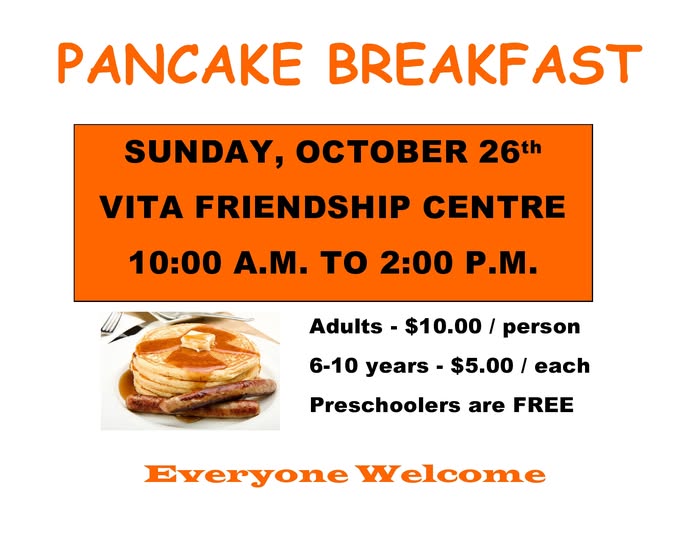 This event has passed. Pancake Breakfast October 26 @ 10:00 am - 2:00 pm « Sprague Arena Halloween Social Trunk or Treat » Gather your family and friends for a morning out – everyone is welcome! Vita Friendship Centre, Sunday, October 26, 2025 Adults $10 Children 6-10 years $5 Preschoolers FREE Organizer: Vita Friendship CentreVenue: Vita Friendship CentreAddress: 226 Home St