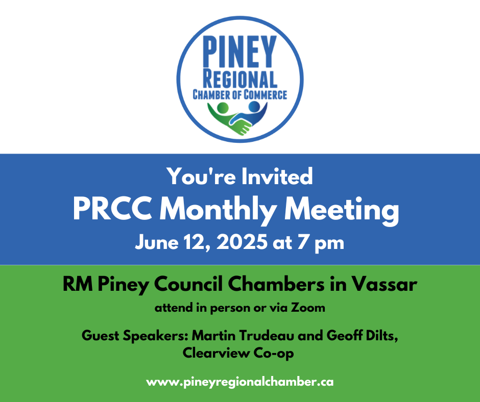 This month, the Piney Regional Chamber of Commerce invites businesses, non-profit organizations and individuals in the RM of Piney. Join the PRCC board of directors and current members from both RMs of Piney and Stuartburn at the RM of Piney Council Chambers in Vassar.