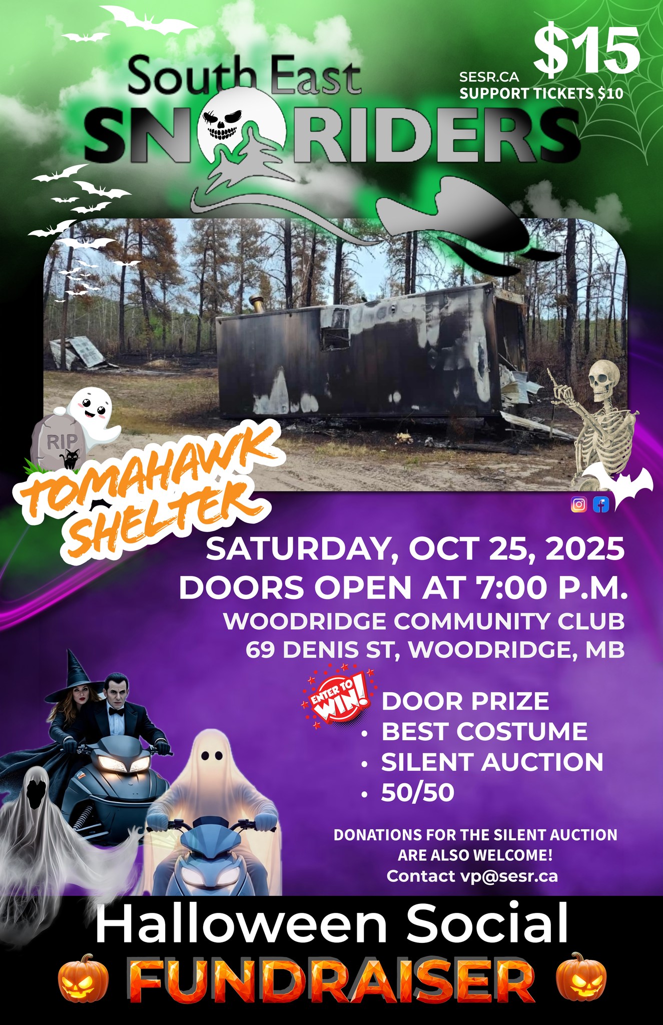 This event has passed. South East Sno-Riders Halloween Social October 25 @ 7:00 pm - 11:59 pm « Southeast Farmer’s Market Sprague Arena Halloween Social » South East Sno-Riders Halloween Social Fundraiser for the Tomahawk Shelter October 25, 2025 Doors Open at 7:00pm Tickets $15 (Support Ticket $10) Door Prize Silent Auction Best Costume 50/50 Organizer: Southeast SnoRidersVenue: Woodridge Community CenterAddress: