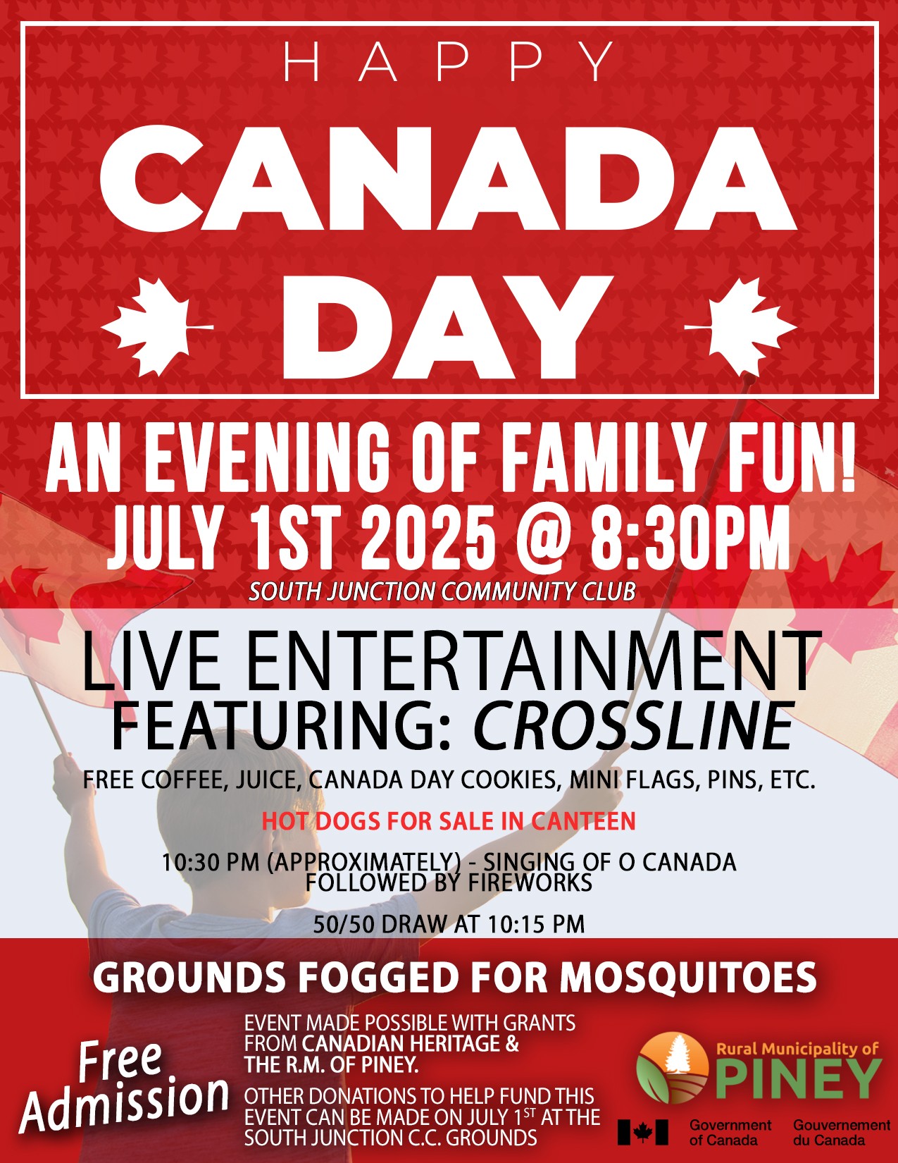 Thank you to sponsors Canadian Heritage and Rural Municipality of Piney. Donations gratefully accepted onsite.