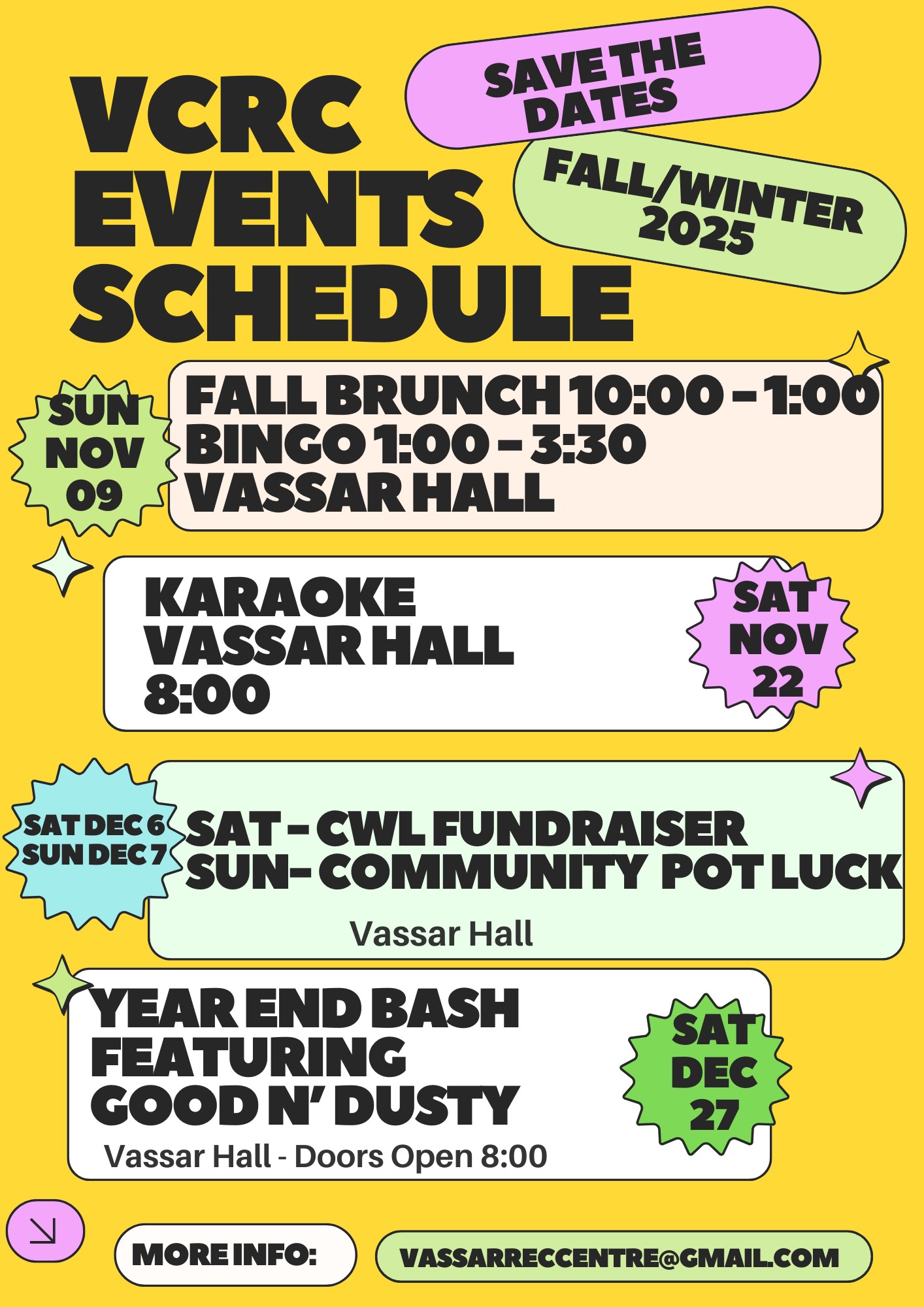 Vassar Community Potluck December 7 @ 11:30 am - 2:30 pm « Woodridge Christmas Craft & Bake Sale Breakfast With Santa » Vassar Community Potluck December 7, 2025 SAVE THE DATE, MORE DETAILS TO COME! More info contact: vassarreccentre@gmail.com Organizer: Vassar Community Recreational Center Inc.Venue: Vassar HallAddress: