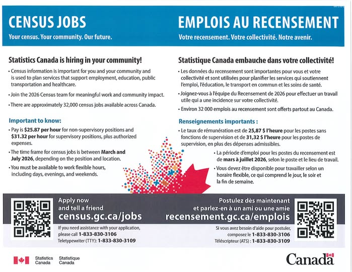 Statistics Canada is hiring enumerators and crew leaders for the 2026 Census.