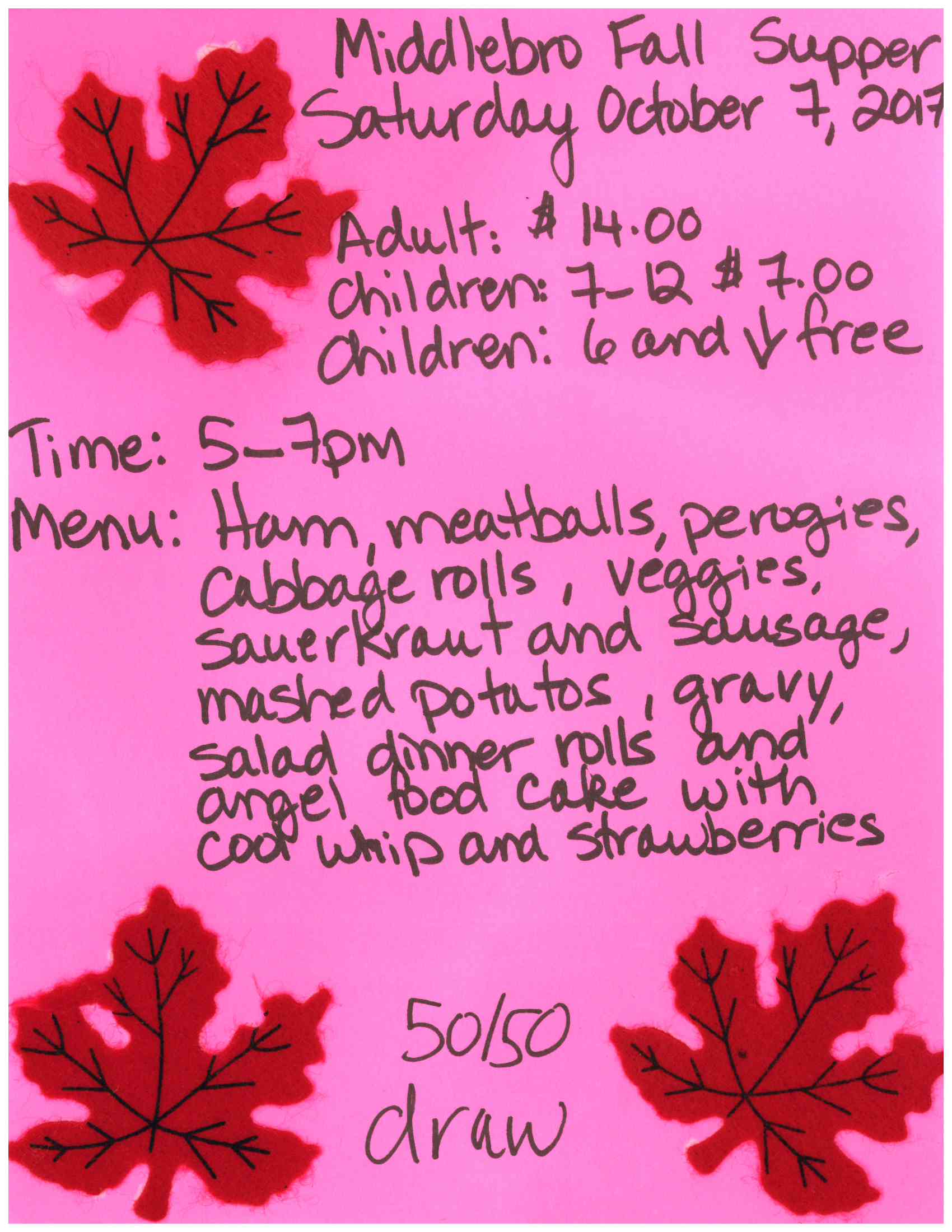 Come out to visit with family and friends at the Middlebro Community Fall Supper.