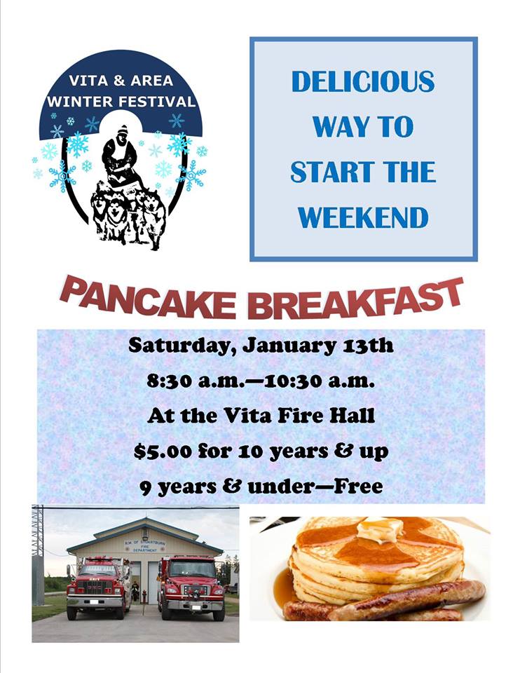 This event has passed. Pancake Breakfast January 21, 2024 @ 8:30 am - 12:00 pm « SJ Brakemen in Concert Manitoba Outdoors Show » Gather your family and friends for a morning out – everyone is welcome! Vita Friendship Centre, Sunday, January 21, 2024 Adults $7 Children 6-10 years $4 Preschoolers FREE Organizer: Vita Friendship CentreVenue: Vita Friendship CentreAddress: 226 Home St